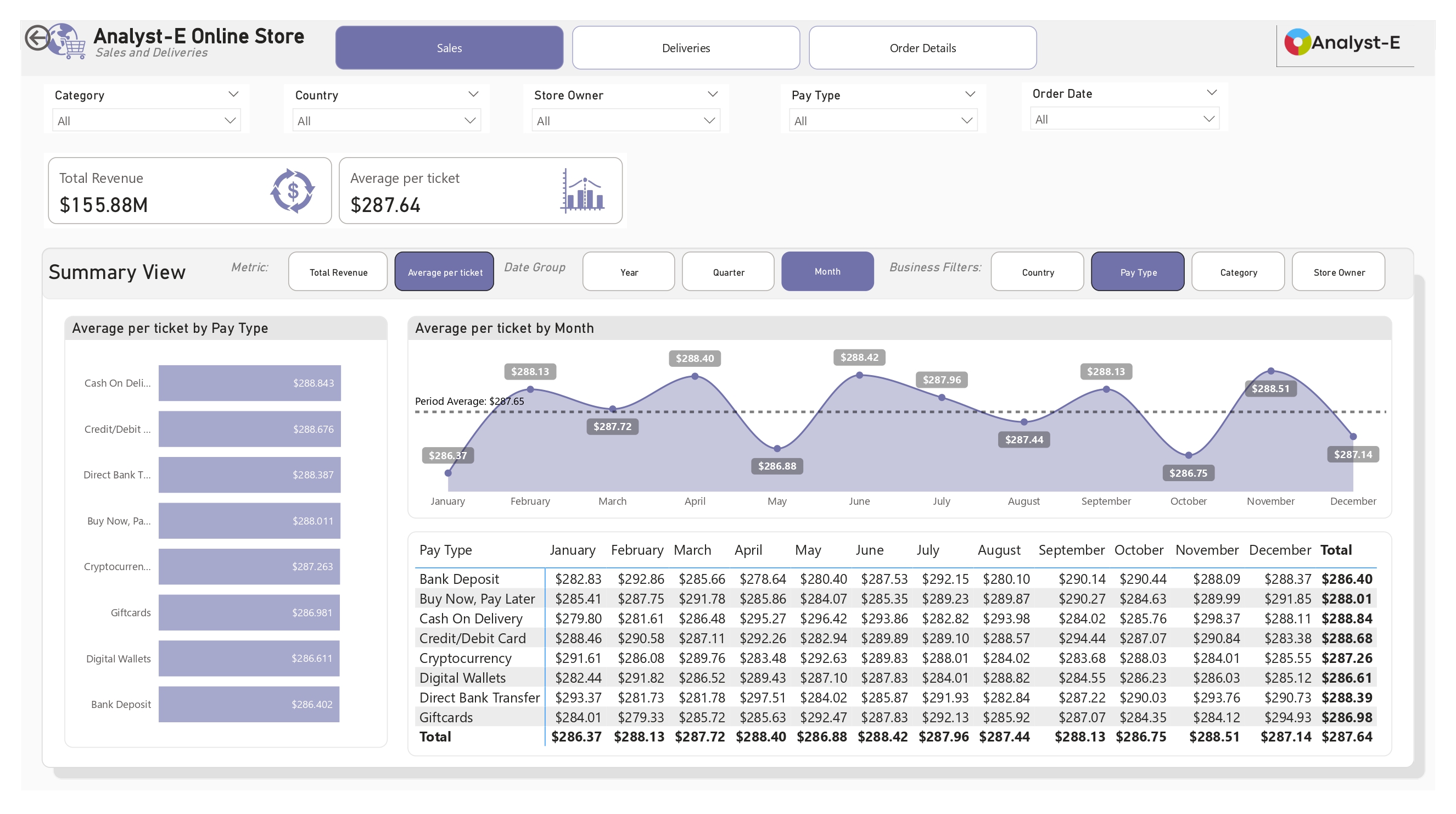 The Analyst-E Online Store Dashboard contains a financial hub displaying key revenue metrics, trends, and detailed breakdowns by various business dimensions, powered by interactive slicers and dynamic charts. It also has a logistical tracker that monitors the delivery process timeline, evaluates efficiency, and visualizes delivery performance trends over time.