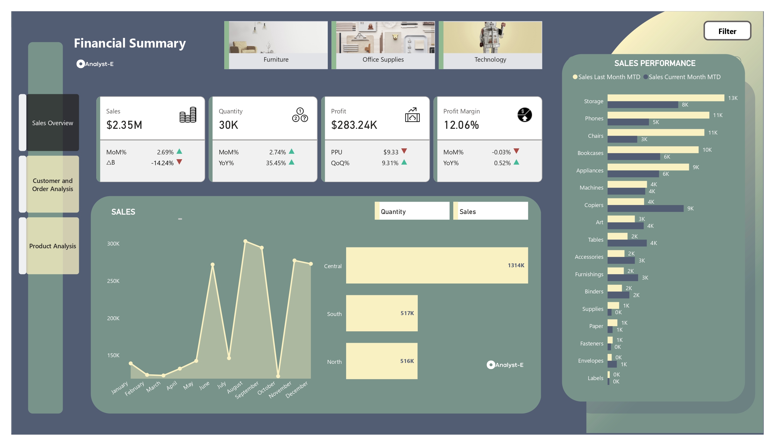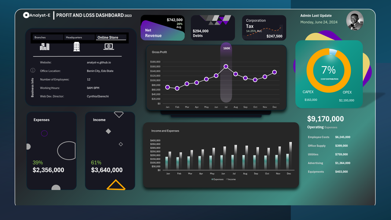The Profit and Loss Dashboard by Analyst-E provides a comprehensive overview of the financial performance of a business, covering its headquarters, branches, and online operations. The dashboard features various visualizations and data presentations for a detailed analysis of different business segments.