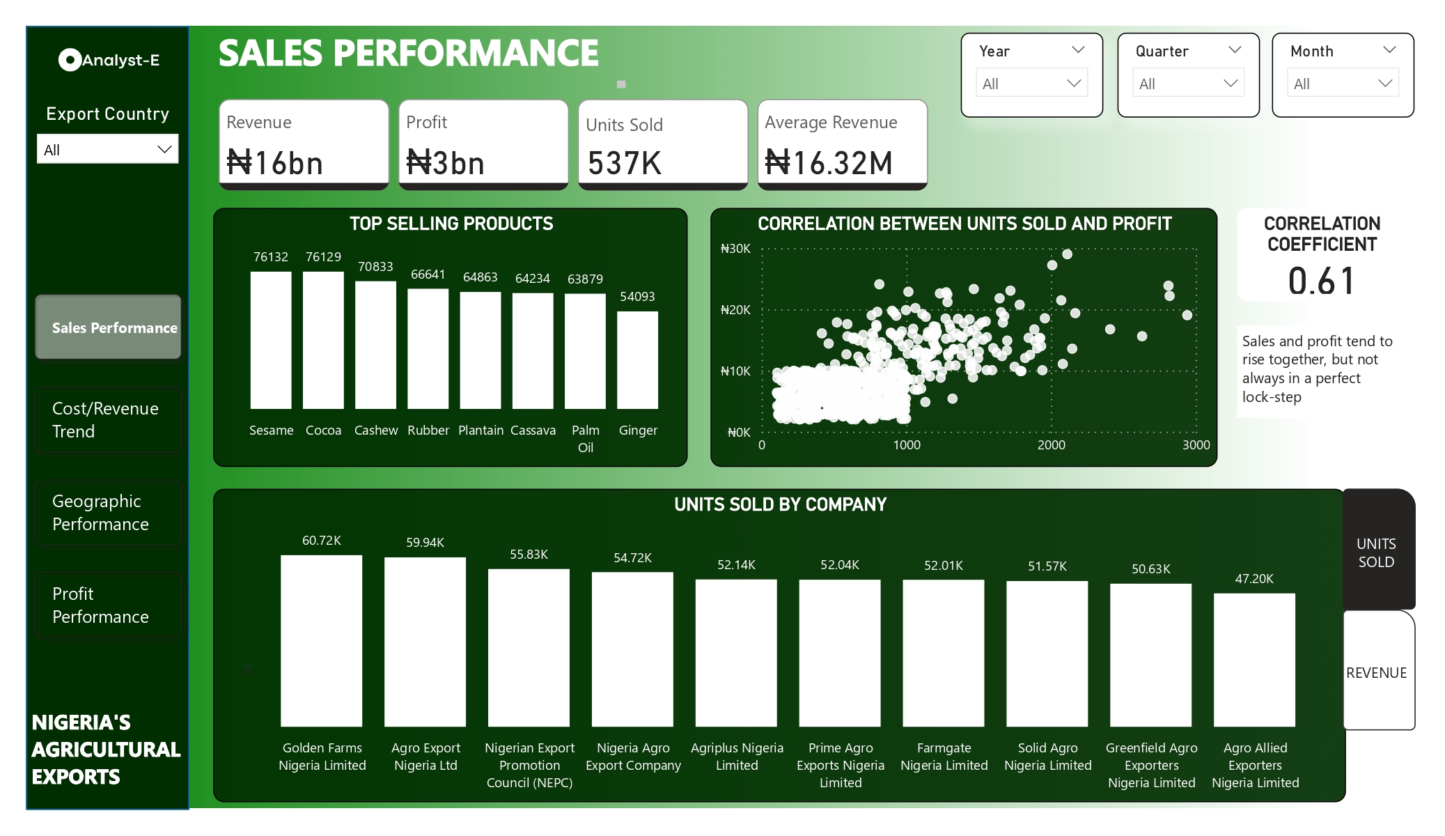 This project analyzes the performance of Nigeria's agricultural exports, focusing on various products such as sesame, cocoa, cashew, rubber, plantain, cassava, palm oil, and ginger.