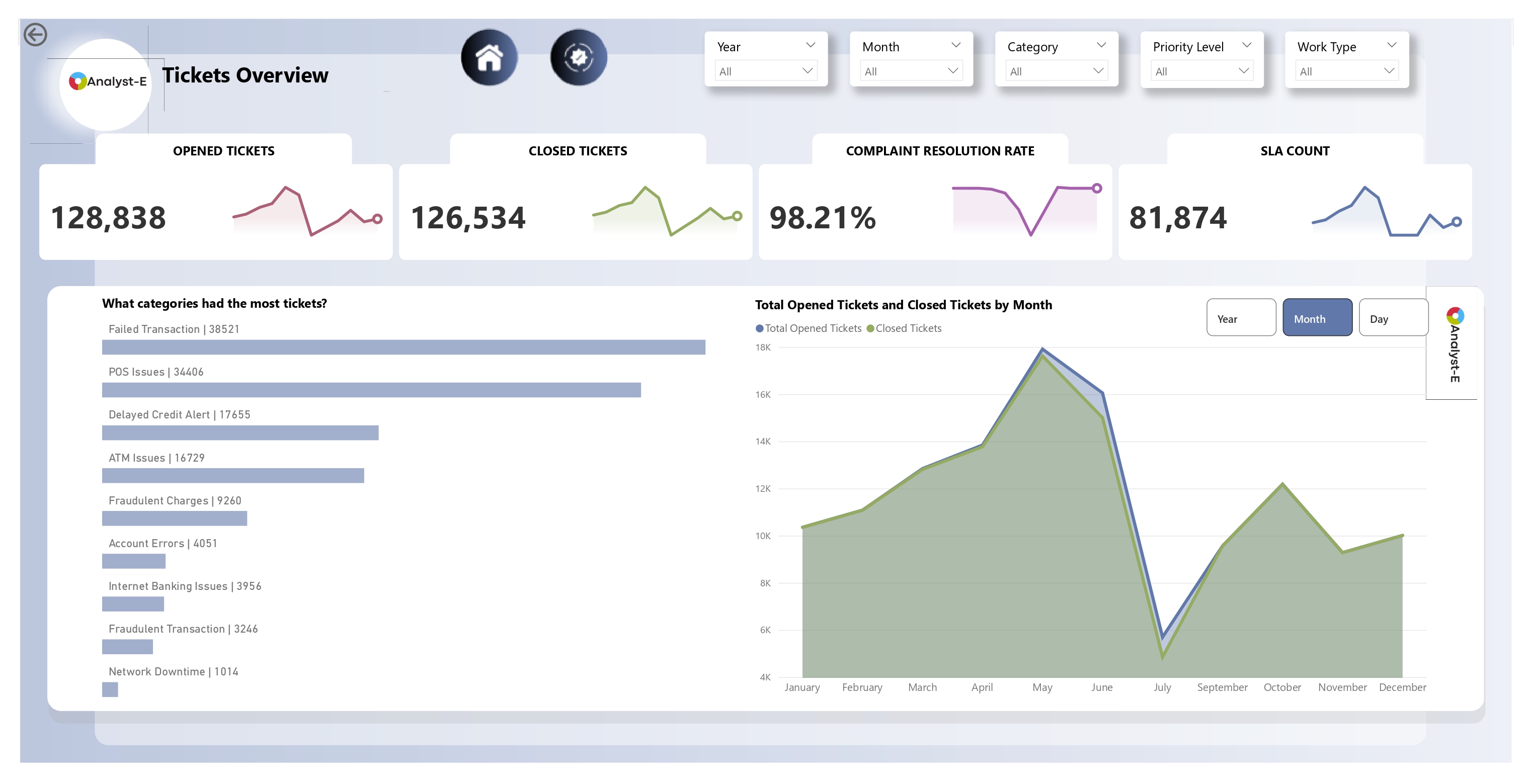 For this personal portfolio project, I took on the role of a BI Developer for a customer service department at a major bank. The goal was to create an interactive dashboard to help managers track and improve their team's performance in handling customer tickets and complaints.
